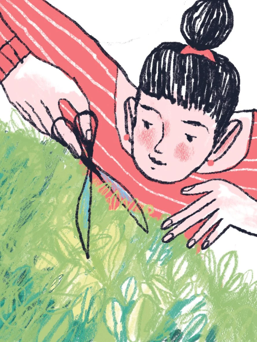 In this piece, I imagined a little girl who grows, panel by panel, alongside the plant she once placed in the ground, until she becomes an elderly woman resting in the shade of what has now become a tall tree.