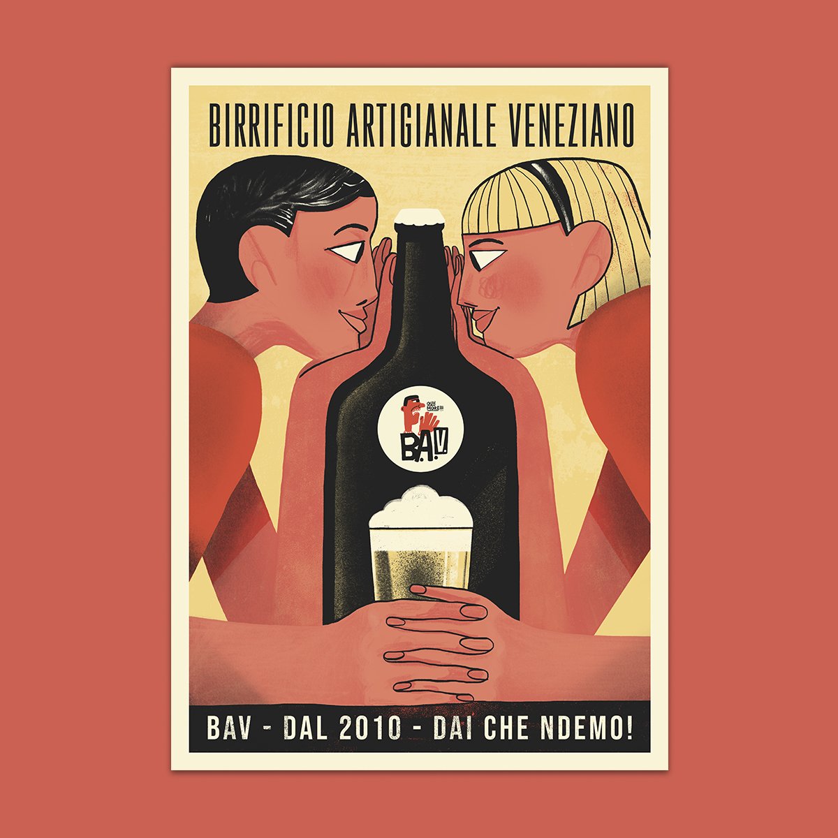 BAV, our trusted Venetian Craft Brewery produces its beers with love. Mattia immediately bonded with them, creating a working relationship and friendship, collaborating with his illustrations for various labels designed, adding to the artists who populate the fantasy world of the brewery. From this relationship was born the first official poster, inspired by the advertising posters of the 50s, which immediately became iconic becoming a work of the gallery in limited series and signed by the artist.